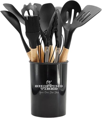 SHOPPING VIBES Your One Stop Shop 12PCS Kitchen Utensil Set Silicone Cooking Utensils Kit Spatula Heat Resistant Wooden Spoons Gadgets Tool for Non-Stick Cookware (Black)