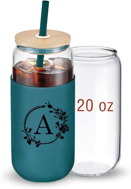 WillCome 20oz Intial Glass Cups with Lids and Straws,Monogrammed Birthday Gifts for Women,Cute Iced Coffee Cups with Protective Sleeve,Drinking Glasses for Smoothie,Beer,Home Essentials Gift,Green,A
