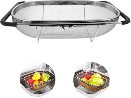 Beauenty Stainless Steel Over the Sink Colander Strainer Basket,Draining Basket,Sink Basket,Sink with Rubber Grip, Fine Mesh, Large Kitchen Gadgets Tools,Strainer Home Kitchen Essentials
