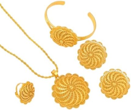24K Gold Plated Jewellery Set, 4-Piece Floral Design, Necklace Earrings Ring Bracelet, Traditional Middle Eastern Style