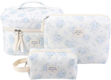 CHAMAIR 3Pcs Coquette Makeup Bag – Quilted Cosmetic Bag Large Make Up Bag Set Aesthetic Floral Toiletry Bag Cotton Travel Skincare Bag for Women Ladies Girls (Style B8)