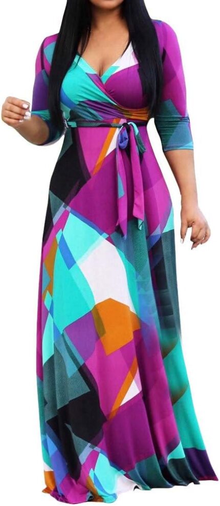 Maxi Dress for Women Fankle Sale Plus size Floral Print 3/4 Sleeve V-Neck Wrap Long Dress with Belt Floor Length