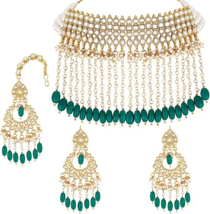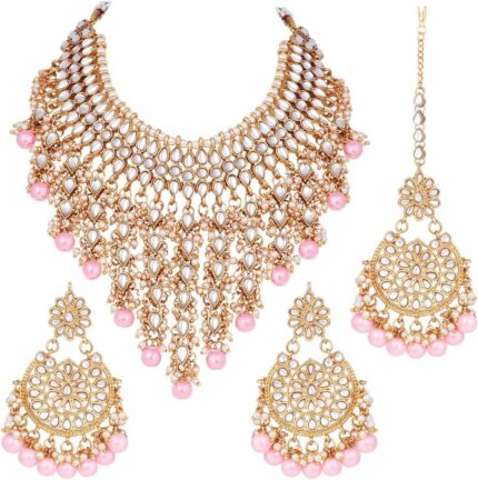 Aheli Gold Plated Traditional Kundan Pearl Drop Choker Necklace Earring Jewelry Set with Maang Tikka for Women