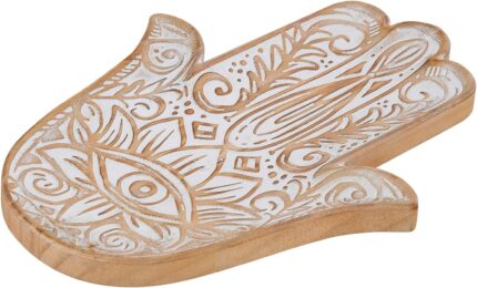 FESTWIND Wooden Engraved Bohemian Decor Tray, Hamsa Jewelry Trinket Key Holder Organizer, Farmhouse Boho Home Decor Hand of Fatima Shaped Tray