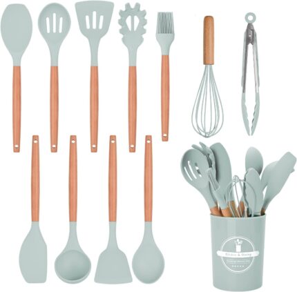 FIOUSY Kitchen Utensil Set, 12 PCS Silicone Cooking Utensils Set with Wooden Handle, Heat Resistant, Nonstick Cookware Tongs Spatula Spoon Set, Dishwasher Safe, Best Kitchen Tools with Holder (Green)