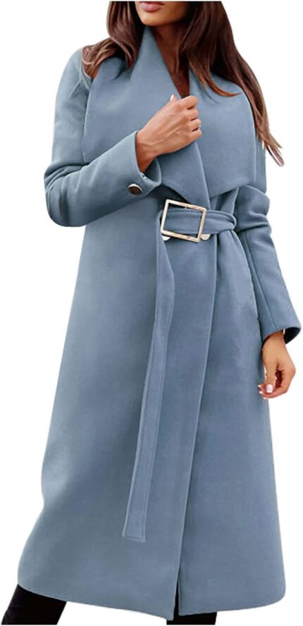 BOXIACEY Trench Coat for Women 2024 Wool Blend Long Pea Notched Lapel Wool Jacket Solid Color with Belt