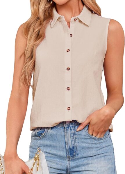 AXUIOKRY Womens Sleeveless Button Down Shirts Cotton Linen Blouses Solid Color V Neck Casual Work Tank Tops
