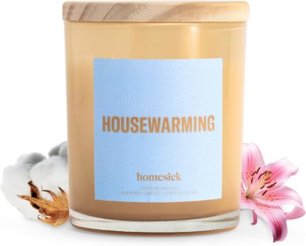Homesick Scented Candles for Home (Housewarming) – 7.5 oz Long-Lasting Natural Soy Wax Blend Jar Candle Gift for Women & Men for All Occasions, 30-35 Hours Burn Time – Notes of Cotton & Water Lily