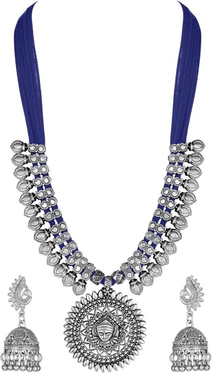 Shining Diva Fashion Latest Oxidised Silver Tribal Cotton Thread Antique Necklace Jewellery Set for Women
