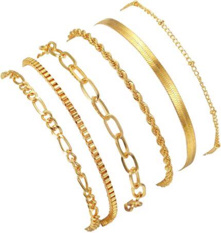 Azonee 5 Pcs Gold Bracelets for Women – Dainty 14K Gold Plated Stackable Bracelet Set, Thin Beaded & Paperclip Chain, Waterproof Fashion Jewelry, for Women