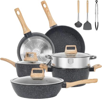 12 Pcs Pots and Pans Set, Granite Nonstick Cookware Sets, Induction Non Toxic Healthy Kitchen Cooking Set with Frying Pans Set, Saucepans, Steamer, PFAS PTFE PFOA PFOS Free, Black