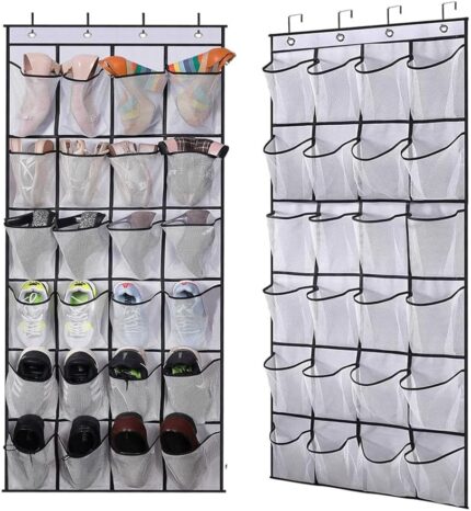 AMERTEER Hanging Shoe Organizer | Door Shoe Organizer | 24 Large Mesh Pockets Shoe Rack For Door | White Transparent Space Saving Shoe Organizer Door Hanger | Hanging Shoe Rack For Closet