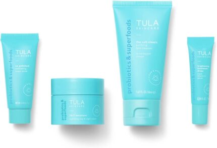 TULA Skin Care On the Go Best Sellers Travel Kit | Facial Cleanser, Day & Night Moisturizer, Sugar Scrub & Face Filter Primer for Glowing, Radiant Skin