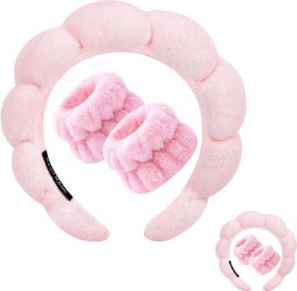 NOG Spa Headband for Washing Face Wristband Sponge Makeup Skincare Headband Terry Cloth Bubble Soft Get Ready Hairband for Women Girl Puffy Padded Headwear Non Slip Thick Hair Accessory(Pink)
