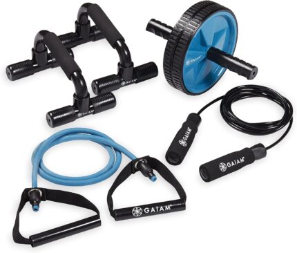 Gaiam Home Gym Kit Equipment Set for Men and Women – Includes Ab Wheel, Jump Rope, Push-Up Bars, Resistance Band with Handles, and Complimentary Exercise Guide – For Total Body Workout at Home