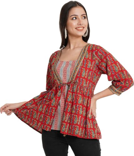 ANARVA Amazon Brand – Jaipuri Cotton Shrug Top with Strappy Inner for Women, Red Paisley, 34
