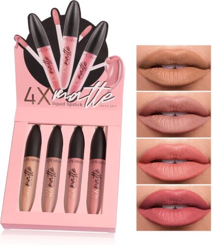 HANDAIYAN Lipstick Set Matte Liquid 4 Colors Long Lasting Waterproof for Women Highly Pigment Velvety Nude Super Stay Soft Hydrating & Lightweight Professional Moisturizing Makeup Lips Gift (1)