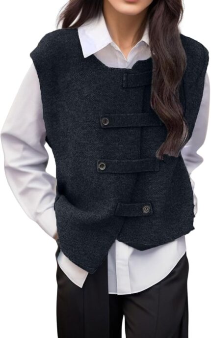 Women’s Fashion Vest Casual Sleeveless Button Cardigan Sweaters Vintage Classic College Autumn Sweater, Black-b, One size