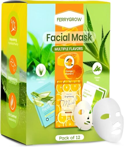 FerryGrow Face Sheet Mask | 3 Variants: Aloe Vera, Orange Vitamin C, Green Tea | Hydrating & Nourishing Skincare for Glowing Skin | Deep Moisture & Self-Care Beauty Sheets 12pcs