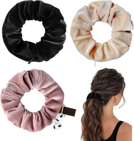 Pack of 4 Black Hair Scrunchies with Zip, Scrunchies Velvet Travel Gadgets for Women, Hair Bobbles with Money Hiding, Valuables Hiding Place, Beach, Hair Bobbles Women’s Velvet Fabric Large for