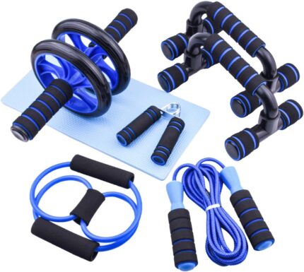 Gym Kit Equipment – Abs Roller Wheel Workout Set with Knee Pad, Push Up Handles Bars, Skipping Rope and Resistance Band – Good for Home Work Out and Gym Fitness Abdominal Training or Weight Loss