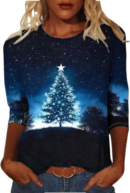 NSICBMNO Womens Christmas Jumper Christmas Scrub Tops 3/4 Sleeve Tops Round Neck Jumpers Novelty Sweatshirt Casual Tunic Baggy Jumper Ladies Winter Tunic Blouses