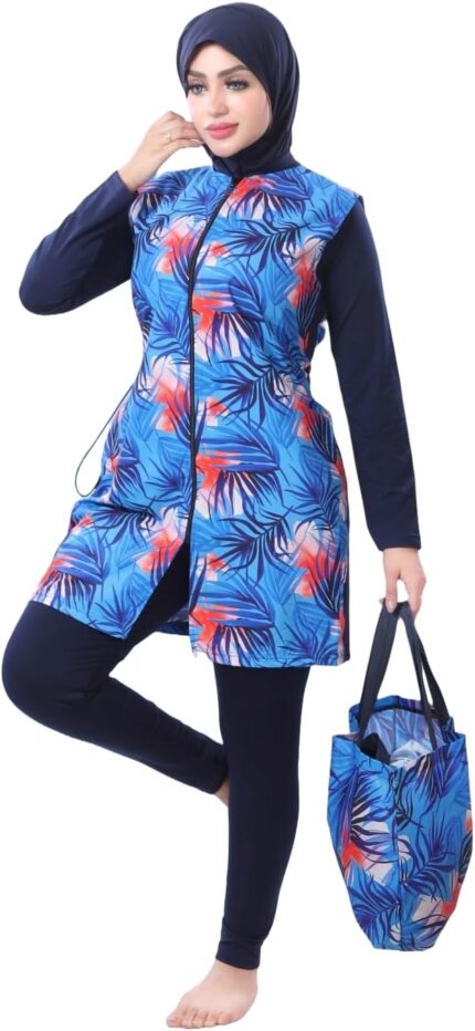 4-Piece Modest Burkini for Women–Full Coverage Swimwear with Printed Sleeveless Swim Vest, Stretch Bodysuit, Hijab and Tote Bag–Islamic Swimming Suit for women