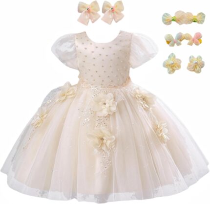 Girls’ Princess Ball Gown, Ivory Pearl Tulle Dress with Floral hair accessories, 3-9 Years, Wedding Party Formal Wear Layered tulle tutu