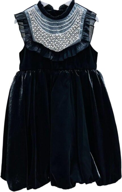 Minime Girls Pearl-Embellished Satin Dress, High Neck Ruffle, A-Line Pleated Skirt, Black, (4-10 Years), Wedding Party Formal Wear