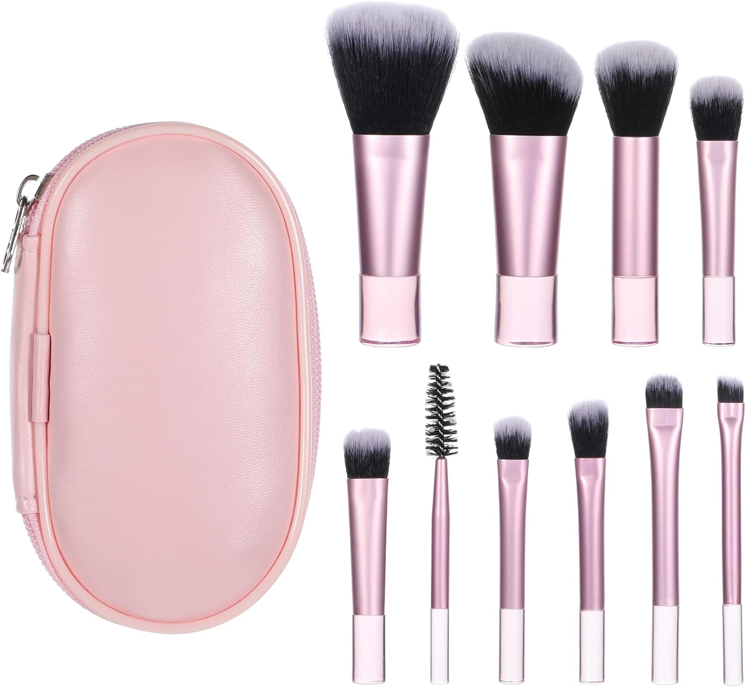 10 Pcs Mini Travel Makeup Brush Set With Pouch Pink Portable Travel Size Makeup Brushes Professional Cosmetic Brush Travel Essentials kits for Women Girls Foundation Brush Blush Powder Eye Shadow