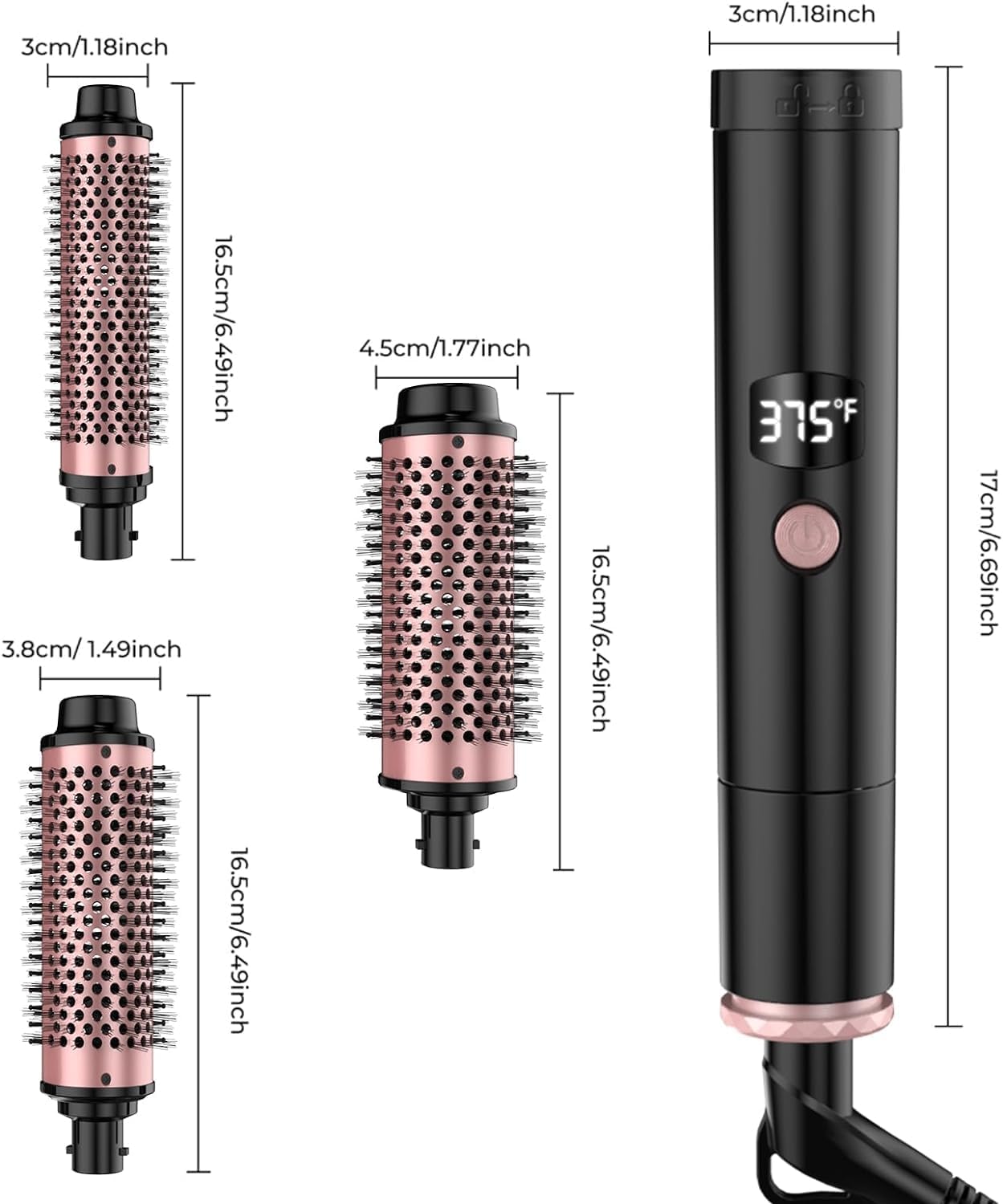 👱♀【Versatile 3-in-1 Design】Upgrade your hairstyling toolkit with our 3-in-1 heated round brush set. Choose from three detachable brush heads in sizes 1.18, 1.49, and 1.77 inches, perfect for achieving various curl sizes and styles. Suitable for all hair lengths, this set transforms your home into a professional salon and makes you your own expert stylist, ideal for everyday use and travel.