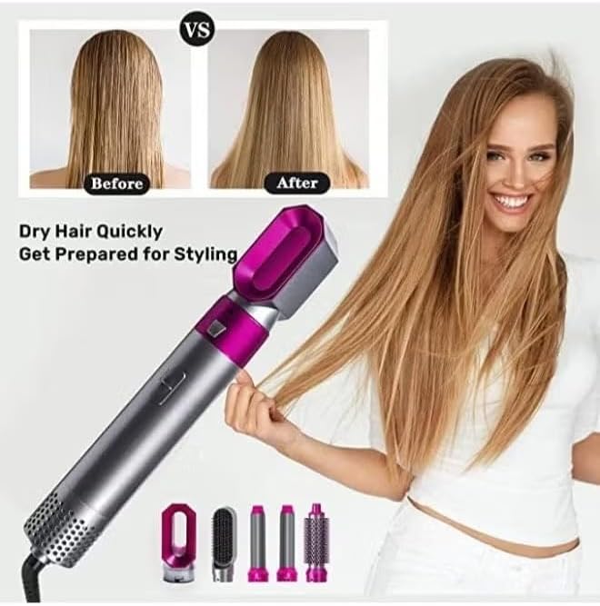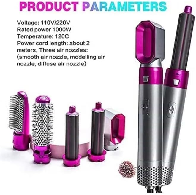 5-in-1 Styling Tool – Includes interchangeable heads for drying, curling, straightening, volumizing, and smoothing.