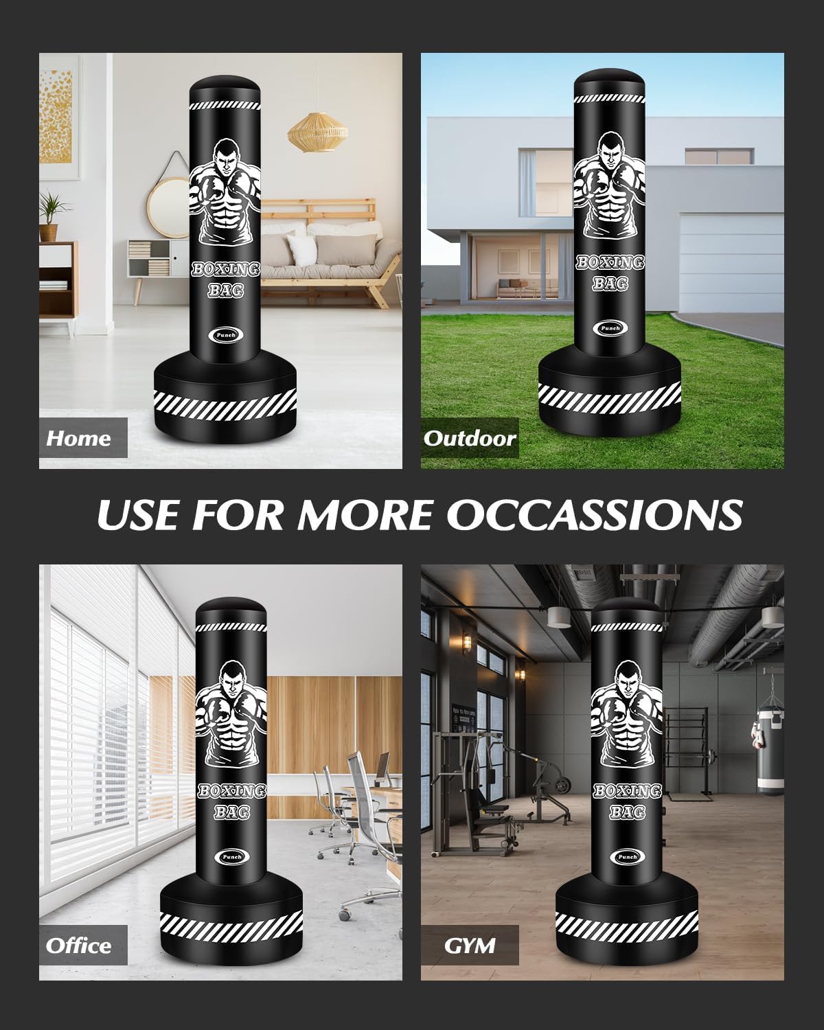 Standing punch bag for adults: 180 cm height is ideal for teenagers and adults. Users of all skill levels. 0.4 mm thickened PVC material makes the adult punching bag with stand more durable and elastic, which will jump back quickly after being hit/kicked, bring you excellent boxing experience.