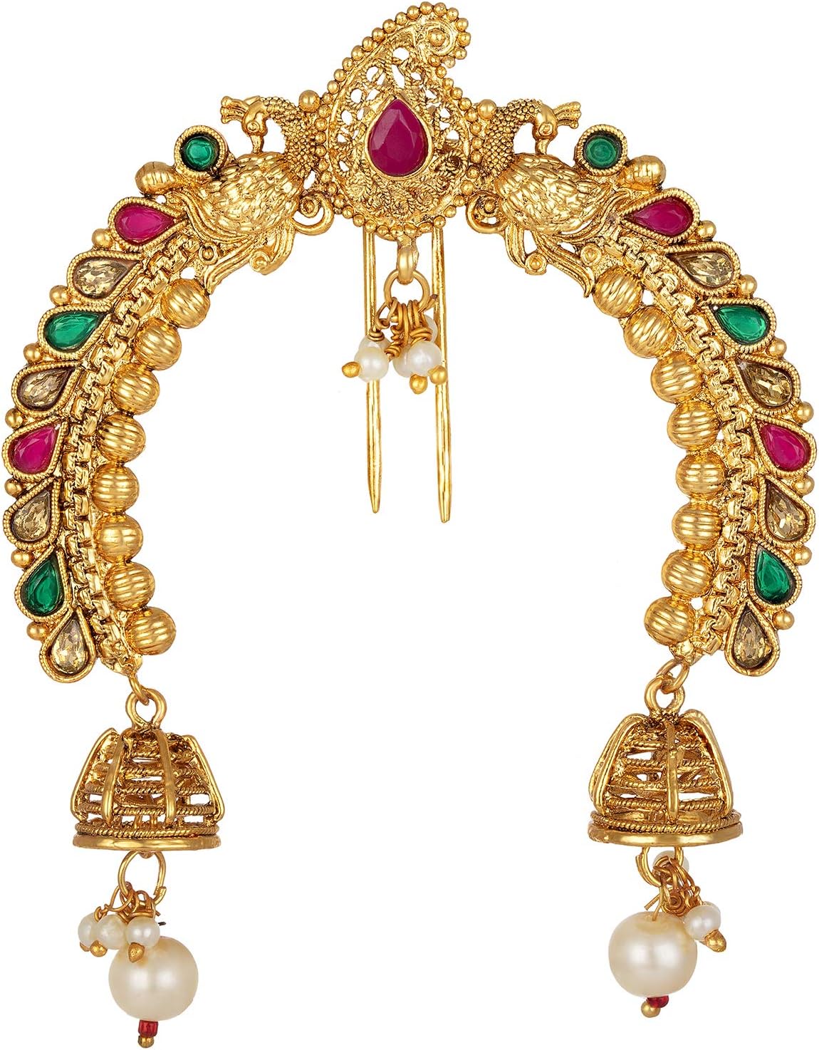 Aheli Faux Kundan Pearl Antique Gold Tone Peacock Design Crafted Indian Hair Brooch Pin Hanging Style Fashion Accessories Ethnic Wedding Jewelry for Women