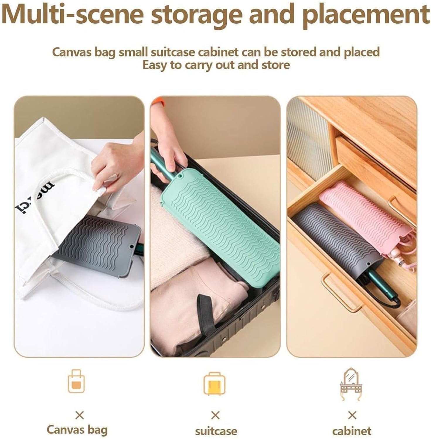 Curling iron pounch mat perfect for travel, foldable and carry easy, this mat is easily wrapped around your hair styling tools for safe storage, the silicone pouch provides a safe place for hot styling tools in your drawer or luggage, such as hair straightener, hair crimping iron, curler wand, blow dryers and salon tools appliances.