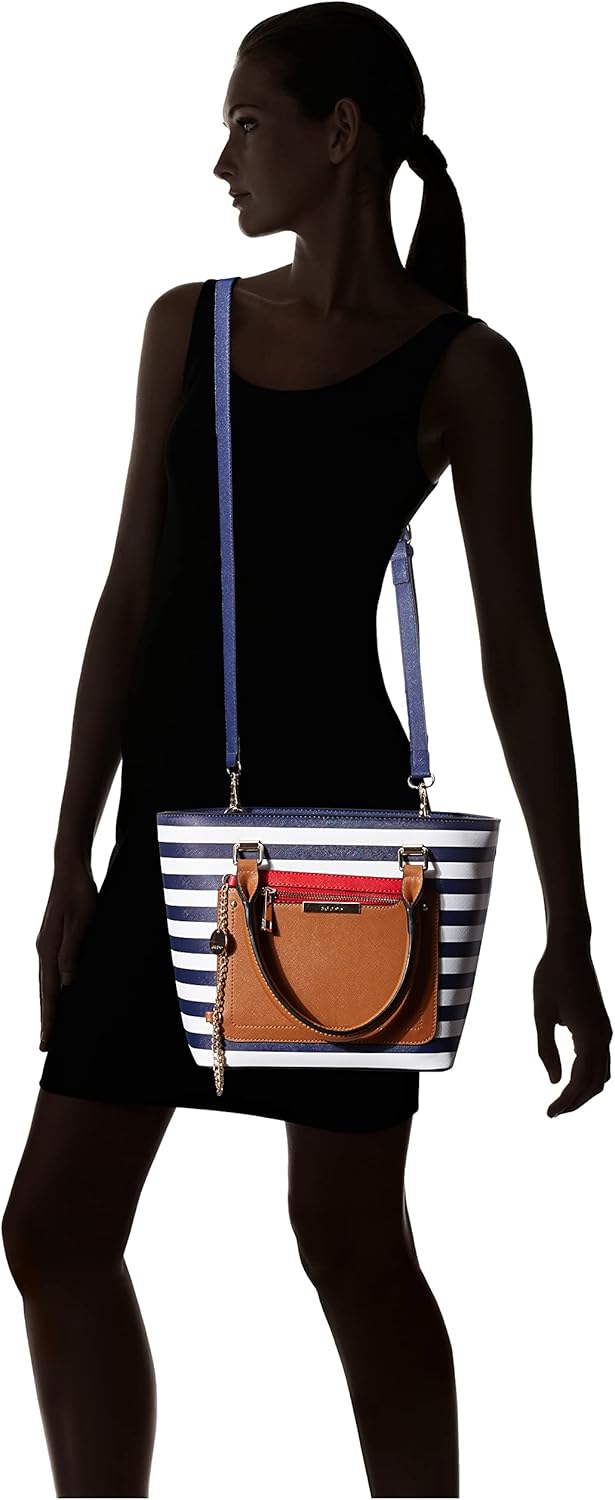 Clean and completely uncontrained; This roomy tote bag is constructed with an adjustable strap and an additional removable compartment.
