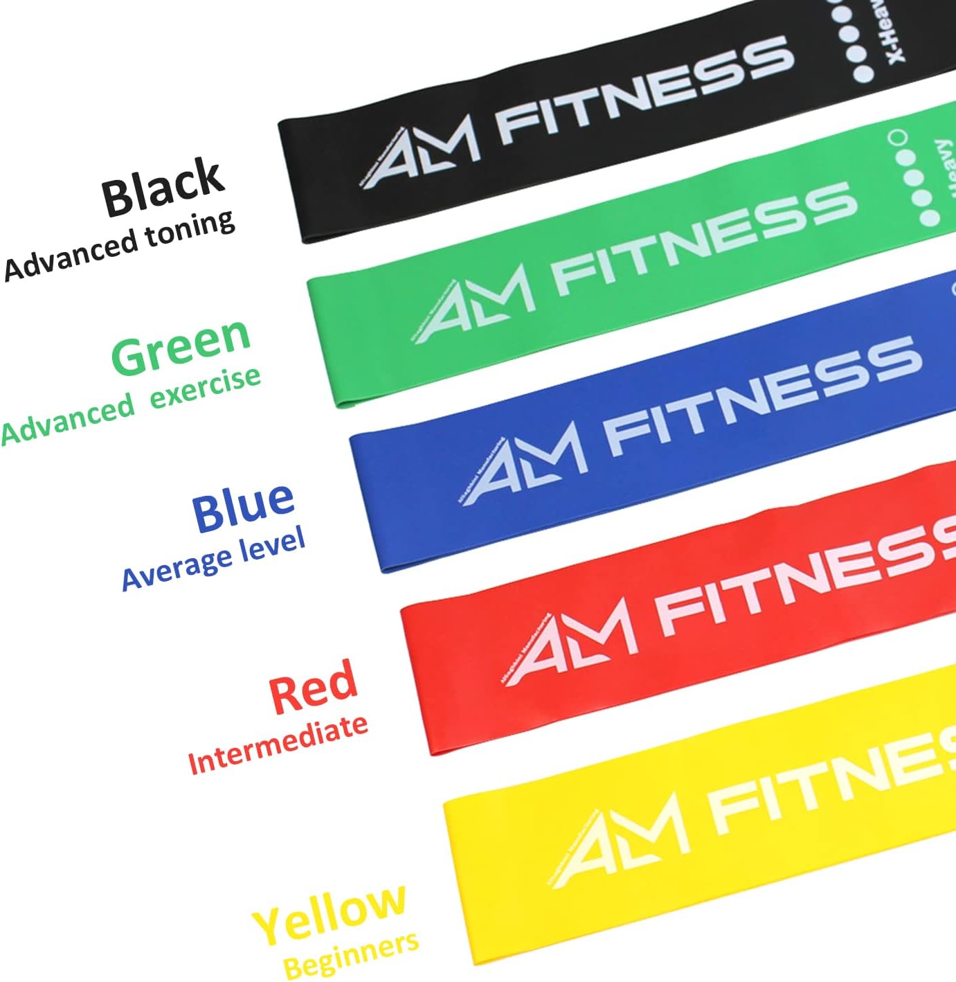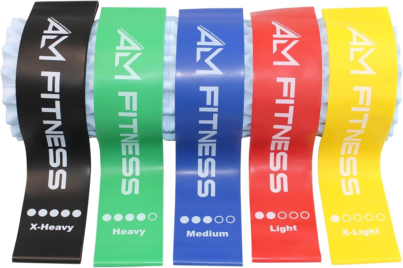 TOP NOTCH EXERCISE BANDS: ALM 60cm by 5cm heavy duty resistance band set comes with five different levels of resistance for fully multifunctional training. Use the heavy bands for strength training, the medium bands to improve yoga and aerobic workout routines, and the light bands for stretching and recovery.