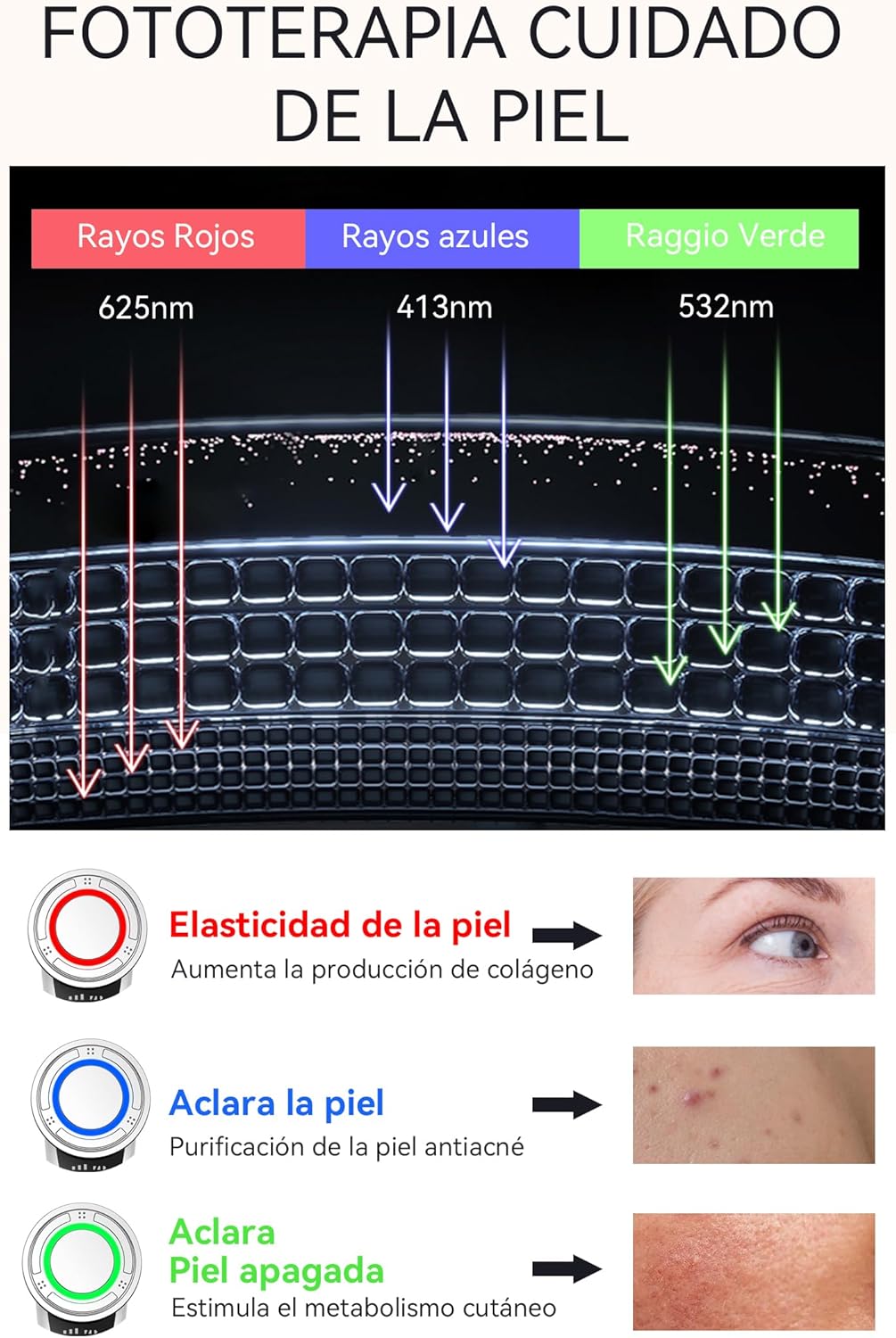 ✓ MASK COMPANION: Cool mode with cryotherapy technology+ vibration+ 3 phototherapies that soothes the skin and eliminates edema. Red light promotes collagen production, restores elasticity. Blue inhibits inflammation to reduce acne. Green evens out skin tone and lightens spots. 2 MIN