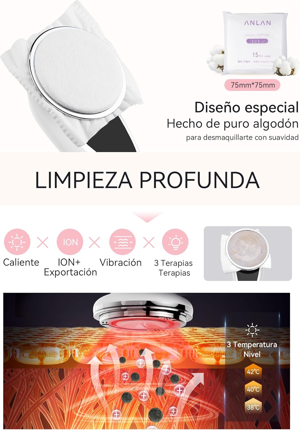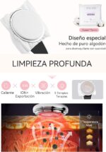 ✓ Deep cleaning: Clean mode with hot+vibration+ion export+red/blue/green light technology. With retaining ring holds a cotton where you will apply the make-up remover, only 5 minutes you will have removed traces of grease and dirt.