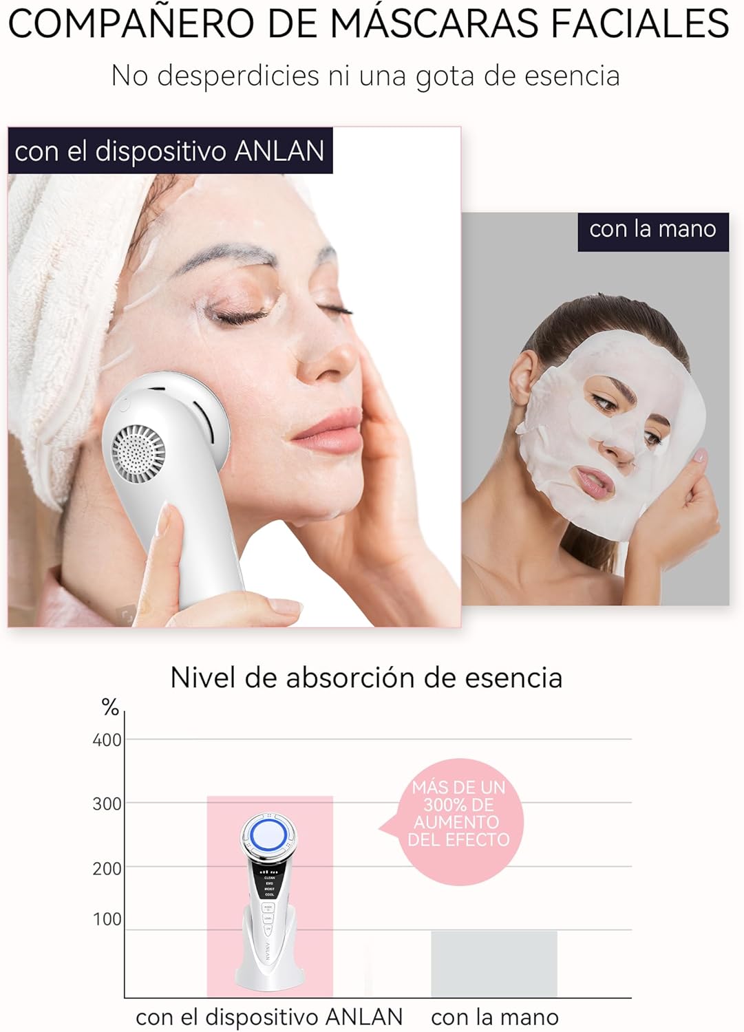 ✓ Rejuvenated and moisturizing: moist mode with ion introduction technology+ vibration+ LED light. When using mask or gel, the choice of moist mode promotes a 300% increase in the absorption of its active ingredients. 5 MIN