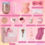 🌸【Relaxing Spa Gift Asket for Women】This gifts for women birthday included all 14 cute gifts: 12oz rose gold cup + straw brush, towel, eye mask, mirror, 120G bath ball, love bath salt, 50g freesia scented candle, 100G rose soap, dried flower greeting card, keychain, 200ml pink bath salt, socks, pink gift box + raffia. Great gifts for women.