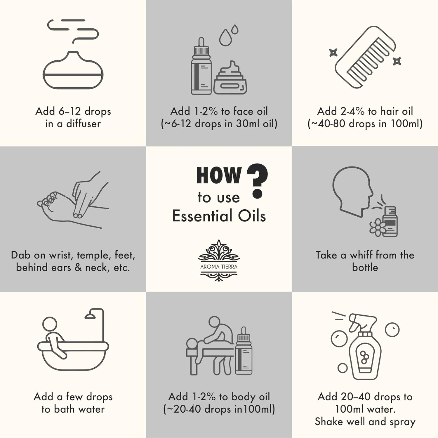 How to use (non-exhaustive) – Use in a diffuser, apply topically (for topical use, dilute in a base oil), add a few drops in water or tea for internal use, use a few drops for culinary use, add in a relaxing bath