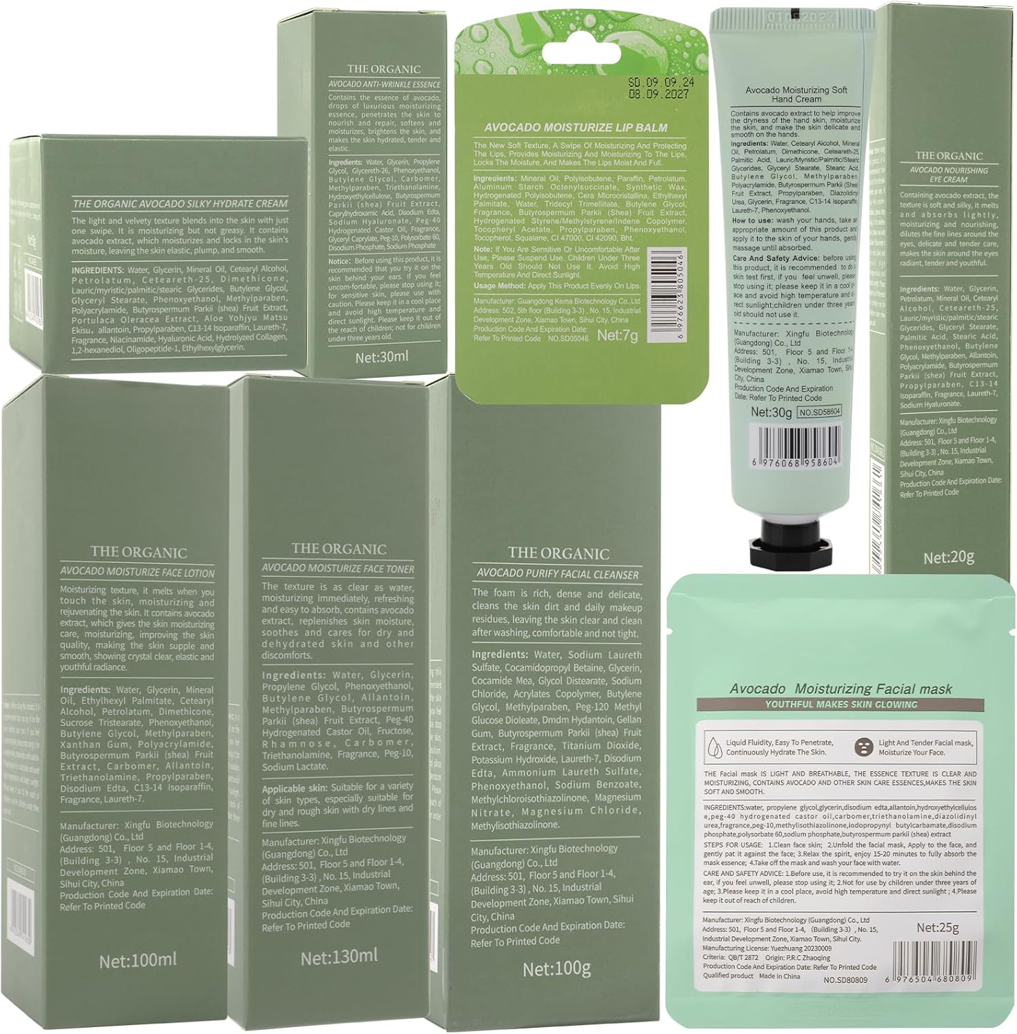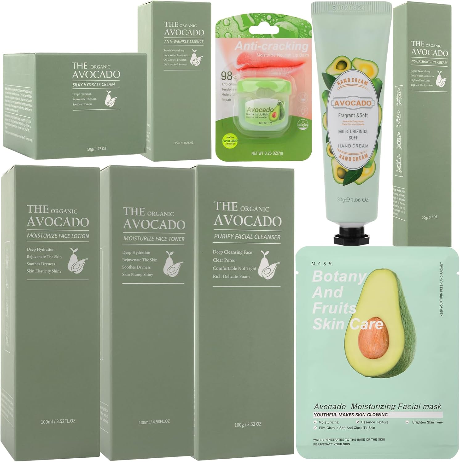 13 Pcs Avocado Skincare Sets & Kits: The skincare set with facial cleanser, toner, lotion, serum, face cream, eye cream, hand cream, lip balm, 5 pcs mask to improve skin texture, gently repair dry and damaged skin, and provide moisture for skin