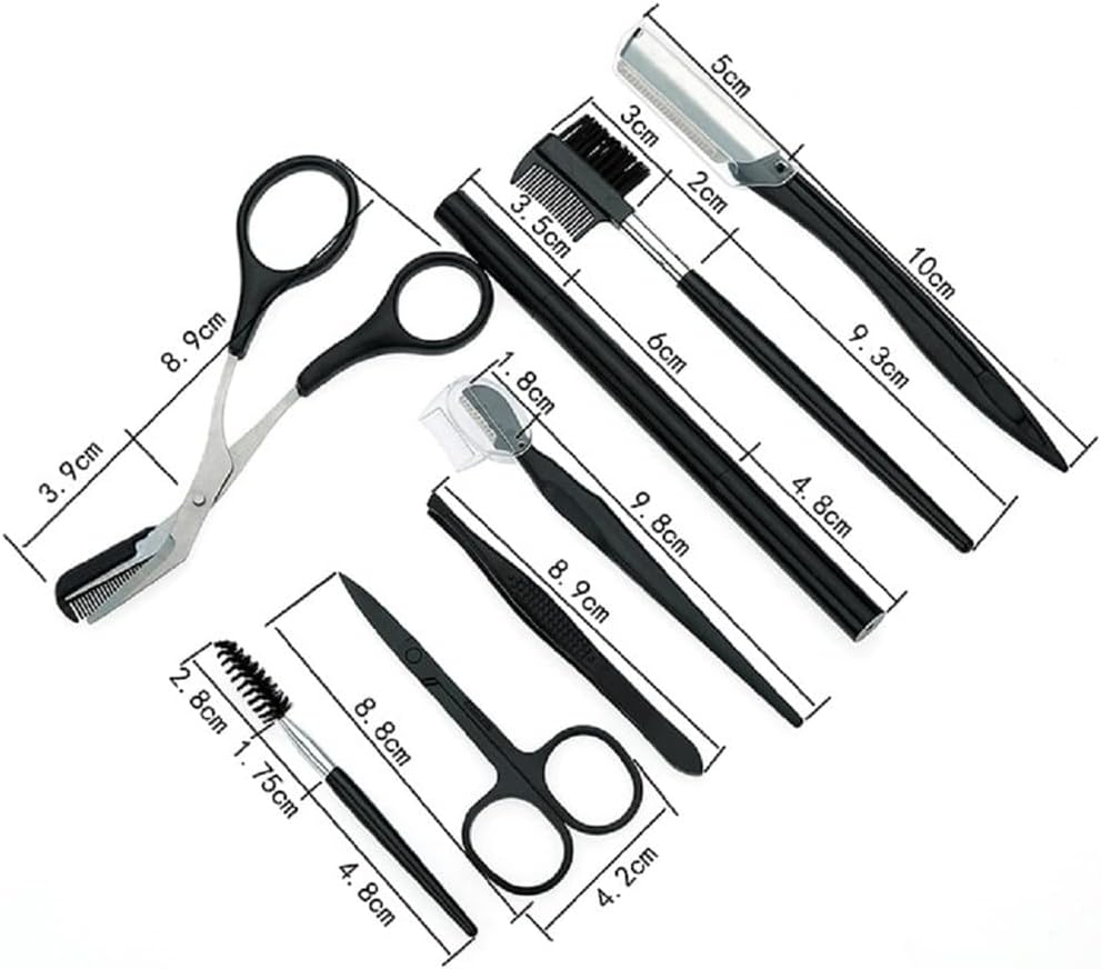 【8-in-1 Multifunctional Eyebrow Kit Set】Includes trimming razor, nose scissors, eyebrow tweezers, eyebrow scissors, 2-in-1 eyebrow brush and comb, eyebrow scraper, eyebrow brush, eyelash brush, travel bag. The eyebrow trimming tool kit includes everything you need for professional eyebrow trimming or perfect eyebrow look.