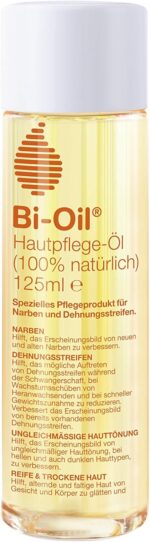 Bi-Oil® skin care oil 100% natural helps to reduce the possible appearance of stretch marks and improve the appearance of existing stretch marks and scars – on a completely natural basis. Because expectant mothers it is not only important to pay attention to the diet, but also to the natural skin care for the baby belly worn with pride. After intensive research, the new Bi-Oil® skin care oil with 100% natural ingredients is now available – specially developed for skin care during and after pregnancy. – 100% natural – No dyes – No synthetic fragrances – No silicone – No preservatives – Vegan high-quality oils from super foods: – Chia: its high content of omega-3 (linolenic acid) supports moisture supply and strengthens the barrier function of the skin – Pomegranate: supports the prevention and improvement of stretch marks – Inca nut: tightened fatty acids, supports elasticity, stores moisture and improves the suppleness of the skin. Bi-Oil® skin care oil 100% natural absorbs quickly, is anhydrous and improves the complexion noticeably and sustainably. Proven effectiveness: proven by studies, testified by midwives! 97% of the subjects showed an improvement in the complexion of their stretch marks after 8 weeks (proDERM Institut Hamburg, 2020).