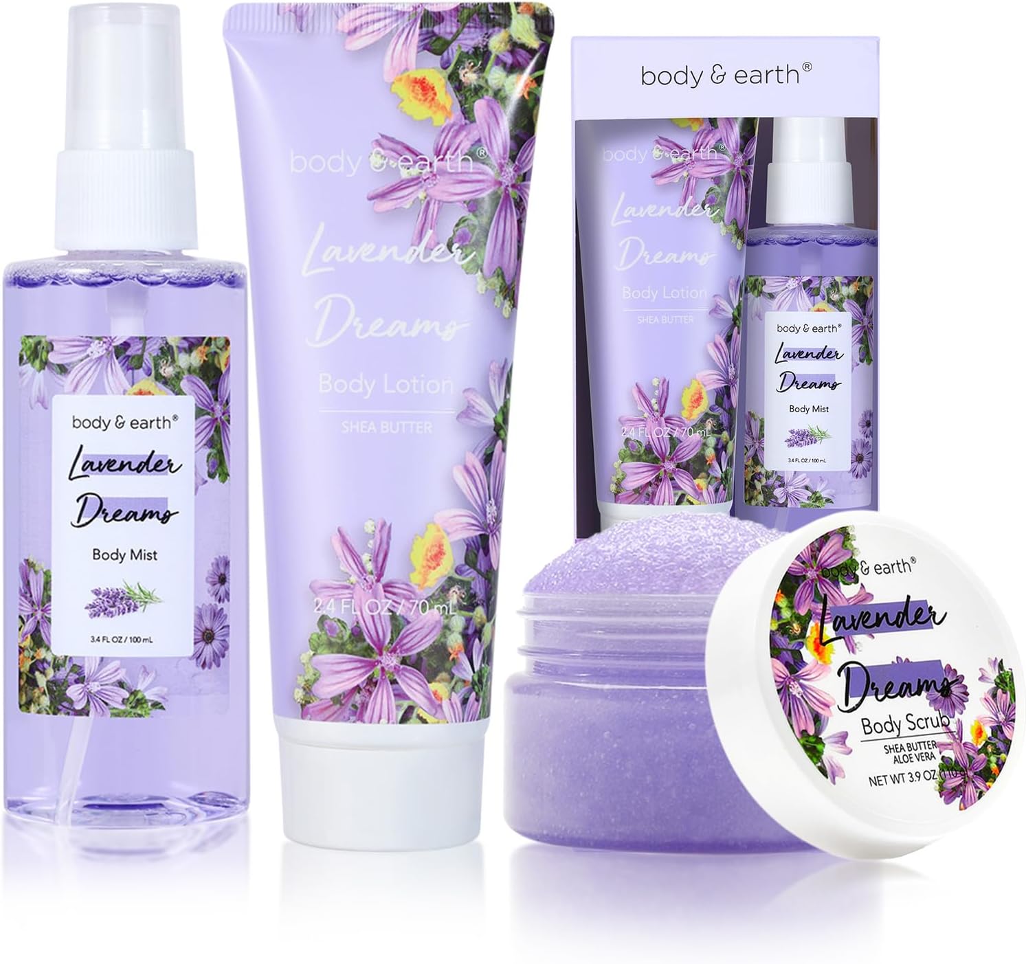 BODY & EARTH Body Mist Gift Set – Spa Gifts for Women, Perfume, Body Lotion, and Body Scrub in a Lavender Dreams Box- Perfect Birthday Gifts for Moms, and Special Occasions,Unique Gift Ideas for Her