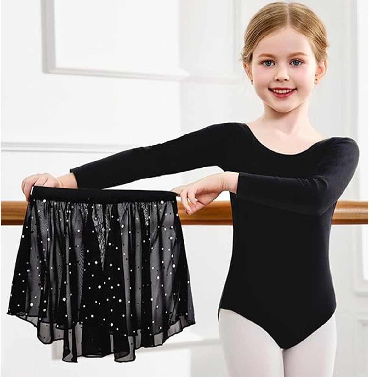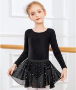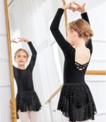 Dance Leotard Set: The 2 piece Ballet Dance Dress include a long sleeve dance top and a shiny skirt.