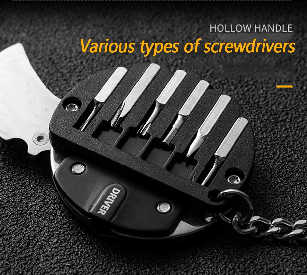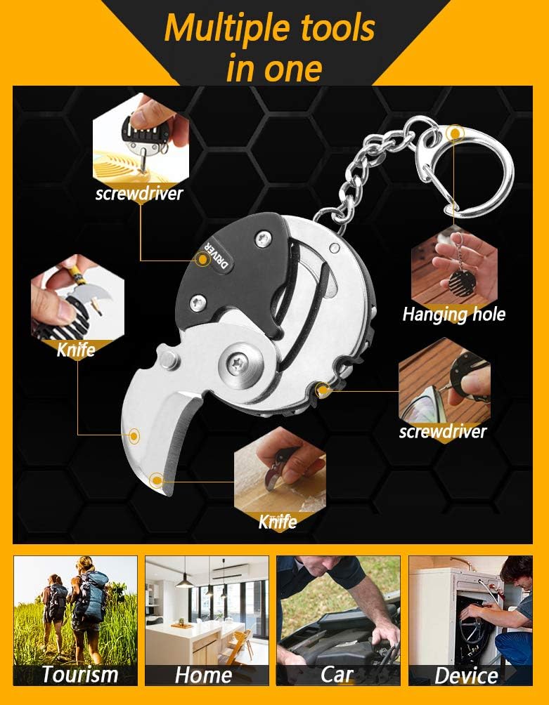 Folding Screwdriver,Multifunction Foldable Slit Screw Cutter,Compact Multi-tool Gadget Keychain for Camping, DIY Activities, Fishing Description: Blade material: 3CR13Handle material: 420 steel engineering plasticSize: Diameter 4.2 0.9CM in height (the highest point is 1.1CM)Expanded length: 6.5CMBlade length: 2.2CMBlade thickness: 2.0MMBlade width: 1.5CMScrewdriver: 6pcs (hidden on the back)Product use: outdoor sports, carry around, home daily use Package included: 1x Foldable Slit Screw Cutter Note: Due to the different monitor and light effect,the actual color maybe a slight different from the picture color.Please allow 1-2cm differs due to manual measurement. Future: The unique design of foldable coin cutter shape, perfect for dailylife.Convenient to use, easy to fold and unfold. There are several mini screws for different use.Suitable for outdoor sports, carry around, home daily use. The multi-Tool set features a folding design, which is super compact and easy to be carried around, preventing loss of small screwdrivers. Compact size makes the folding pliers a best partner for any outdoor activity including hiking, camping, fishing, survival.