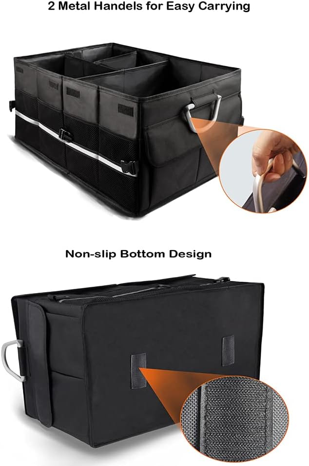 ♔【Exquisite & Considerate Details】 – Equipped with 2 reinforced aluminum metal handles, the car storage box is comfortable to hold, grip and move around. And to keep it upright and sturdy, every panel is with stiff plates(bases plates, side plates. What’s more, this trunk organizer has waterproof barrier, this keeps spills contained. You’ll never worry about stained upholstery or any lingering food smells!
