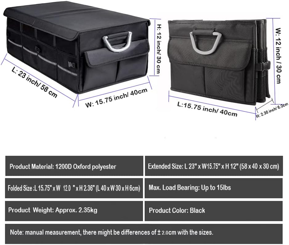 Car Trunk Organizer Holder, Auto Cargo storage Box, Container Boot Case with Foldable Cover Lid, Adjustable Pockets, Collapsible Multi-Compartment, Non-Slip Bottom, Waterproof Oxford–Black 23”/58cm